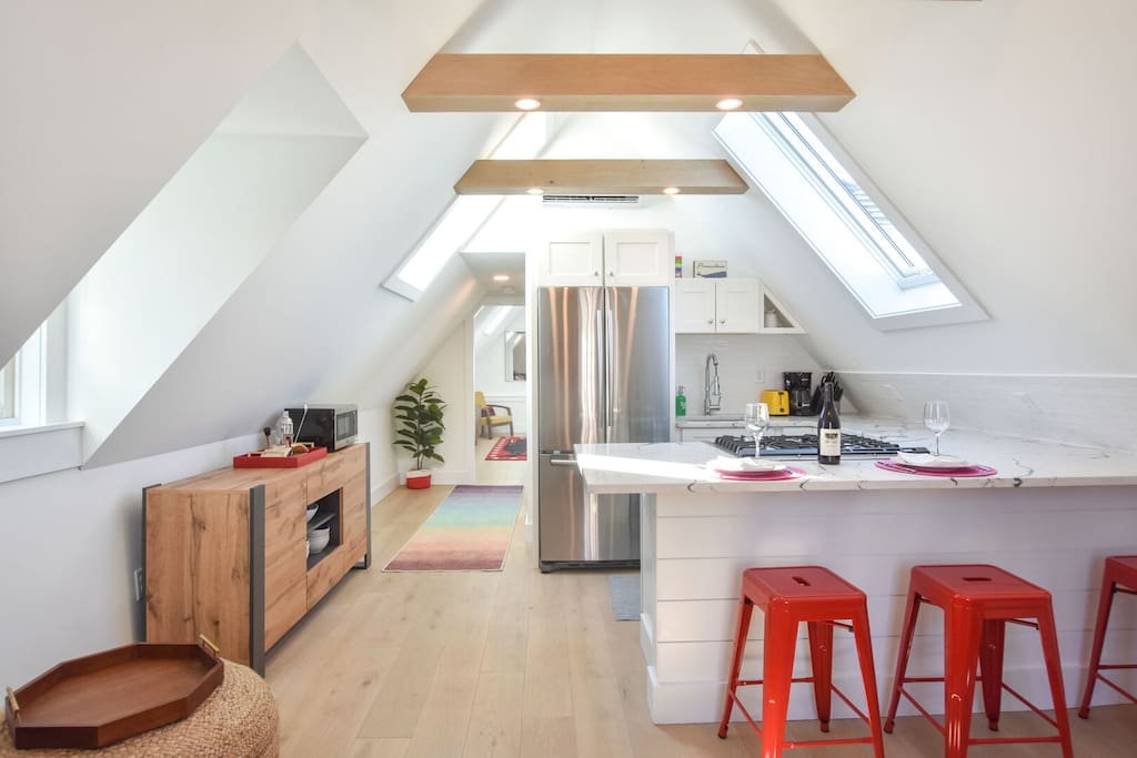 Immerse yourself in the vibrant pulse of Provincetown this summer at the Roxy—a chic and newly constructed West End Condo designed for indulgence and relaxation. Situated between Bradford and Commercial Streets, this centrally located haven offers an idyllic retreat just moments away from the sun-kissed shores of Cape Cod Bay, including the beloved Dog Beach, and the eclectic array of shops and eateries lining the coast. <br>Kickstart your day with a burst of energy at Muscle Beach Gym, conveniently a mere two-minute walk away, or savor a leisurely brunch before joining the festivities at the renowned Afternoon Tea Party at Boatslip, also just a stone's throw away.<br><br>Retreat to the comfort of our A-Frame (2nd-Floor) Walk-Up, boasting a contemporary open layout adorned with high vaulted ceilings, rustic natural beams, and ample skylights flooding the space with sunlight. Unwind on the plush grey couch in the main living area, indulging in entertainment on the Smart TV or relishing a moment of tranquility.<br><br>Prepare a delectable Clams Casino dinner for two in the pristine, fully equipped kitchen featuring stainless steel appliances and a stylish marble-topped island, perfect for intimate culinary adventures.<br><br>As the day transitions into night, retire to the inviting king bedroom, complete with vaulted ceilings, a skylight, and ample storage for your belongings. Refresh in the luxurious full bathroom before stepping out onto your private deck to admire the enchanting views of Provincetown.<br><br>Indulge in al fresco dining and relaxation on your deck, equipped with a propane grill and dedicated parking space. Additional amenities include a stackable LG washer/dryer, WiFi, and linens provided for your comfort.<br><br>With convenient access to nearby grocery and liquor stores, as well as a plethora of dining options including Liz’s Cafe, Pop+Dutch, and Nor’ East Beer Garden, every need is effortlessly met. Don't miss your chance to experience the allure of the Roxy—book now for an unforgettable summer getaway in Provincetown!<br><br>Home Details:<br>-No pets (fines remitted)<br>Bedrooms<br>-Total: 1<br>-Bedroom: 1 King Bed<br>Bathrooms-Total: 1<br>-Bathroom: Full Bath w/ Shower<br>Other Amenities<br>-Fully Equipped Kitchen<br>-Mini-Split A/C System (like Central A/C) -WiFi -Smart Lock -Smart TV -Cable/Streaming -Washer/Dryer -Private 2nd-Floor Deck -Propane Grill -please note outdoor amenities are seasonal -Walk to Water -Walk to Town -1 Parking Space -Sheets and Bath Towels Provided with Beds made Upon Arrival -Cleaned with Hospital Grade Disinfectant -C0409982420